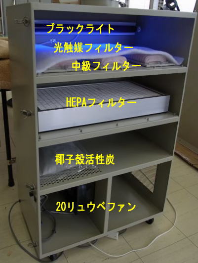 1段目:光触媒(臭い取り)・中級フィルター(下段のHEPAフィルターの目詰まり防止)