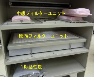 各フィルターはユニット構造になっており、上下HEPAフィルターを取り付けたり、光触媒を2段に 取り付けたり、現場に沿って最適な設定が出来ます。又、メンテナンスが全て前面より可能です。 |
